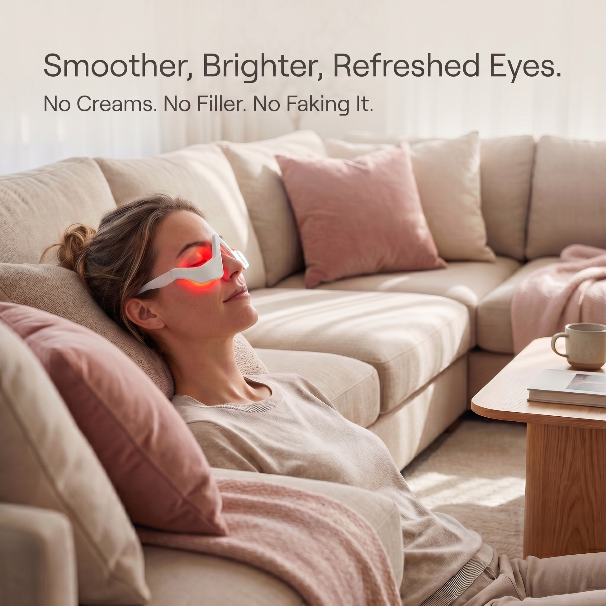 Red light therapy and EMS microcurrent working together to visibly improve puffiness, dark circles and fine lines. 10 minutes a day. Made for everyone. No creams. No clinics.