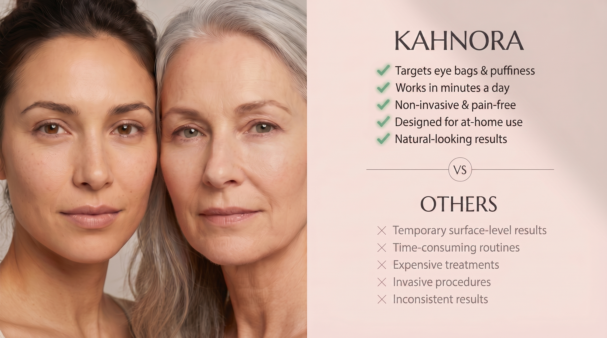 Clinic treatments for under eye rejuvenation cost hundreds per session. Creams promise everything and deliver nothing. Kahnora puts two clinically used technologies in your hands at a fraction of the cost. One device, unlimited treatments, visible results you can actually see in the mirror.